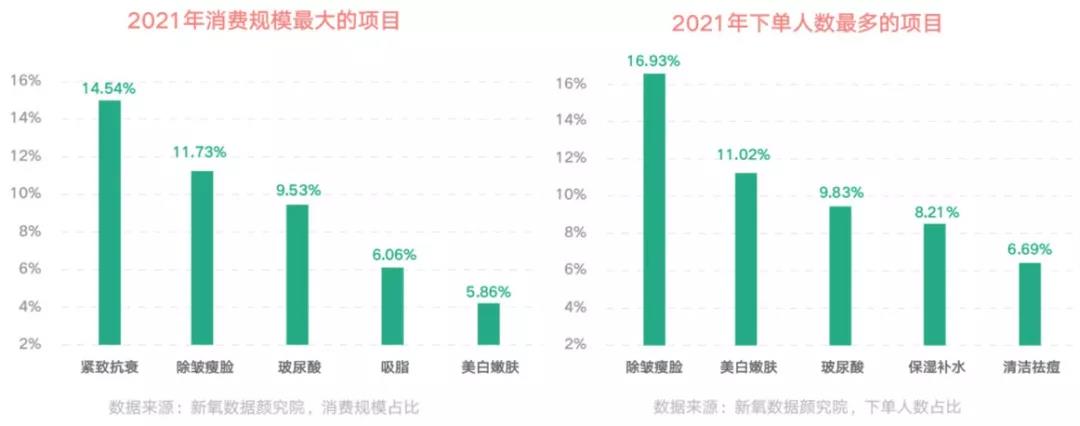 ▲2021年各類醫美項目消費(fèi)規模占比和下(xià)單人朋站數占比(來源:《2021醫美行業白(bái)皮書(shū)》)